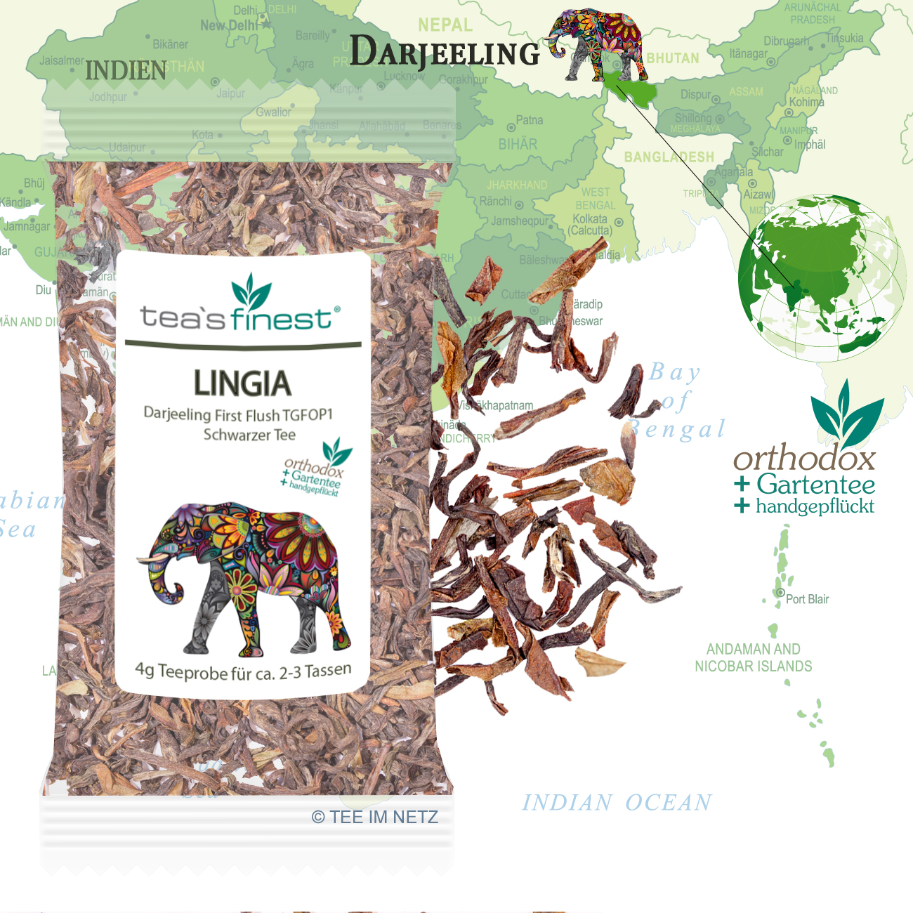 Der Teegarten Lingia besteht seit 140 Jahren und liegt im Golden Valley des Darjeeling* Distrikts an der Grenze zu Nepal in einer Höhe von 1.848 m. Lin-ge bedeutet in der lokalen Sprache "Mitte" von 8 Bergspitzen. Von dort oben hat man einen wunderschönen Blick auf die gewaltigen Kanchenjunga Formation des Himalaya Gebirges. Die hier gepflanzten Büsche stammen überwiegend aus China und sind für das einzigartig rosige Aroma verantwortlich, welches kein anderer Teegarten aufweist. Der Darjeeling* Lingia ist für seinen weichen Charakter mit leicht süßem Geschmack begannt und beliebt. Ein unvergleichlicher Genuss!
