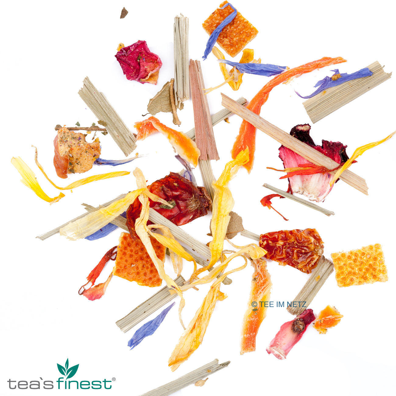 Zutaten: Sultanas, Apfelstücke, Mangowürfel, Zitronengras, Hagebuttenschalen, Hibiskusblüten, Orangenschalen, Karottenraspeln, Brennesselblätter, süße Brombeerblätter, gefriergetrocknete Mandarinenorangenfruchtstücke, Kornblumen, Malvenblüten, Ringelblumen, Rosenblüten, Rosenknospen, Färberdisteln.
