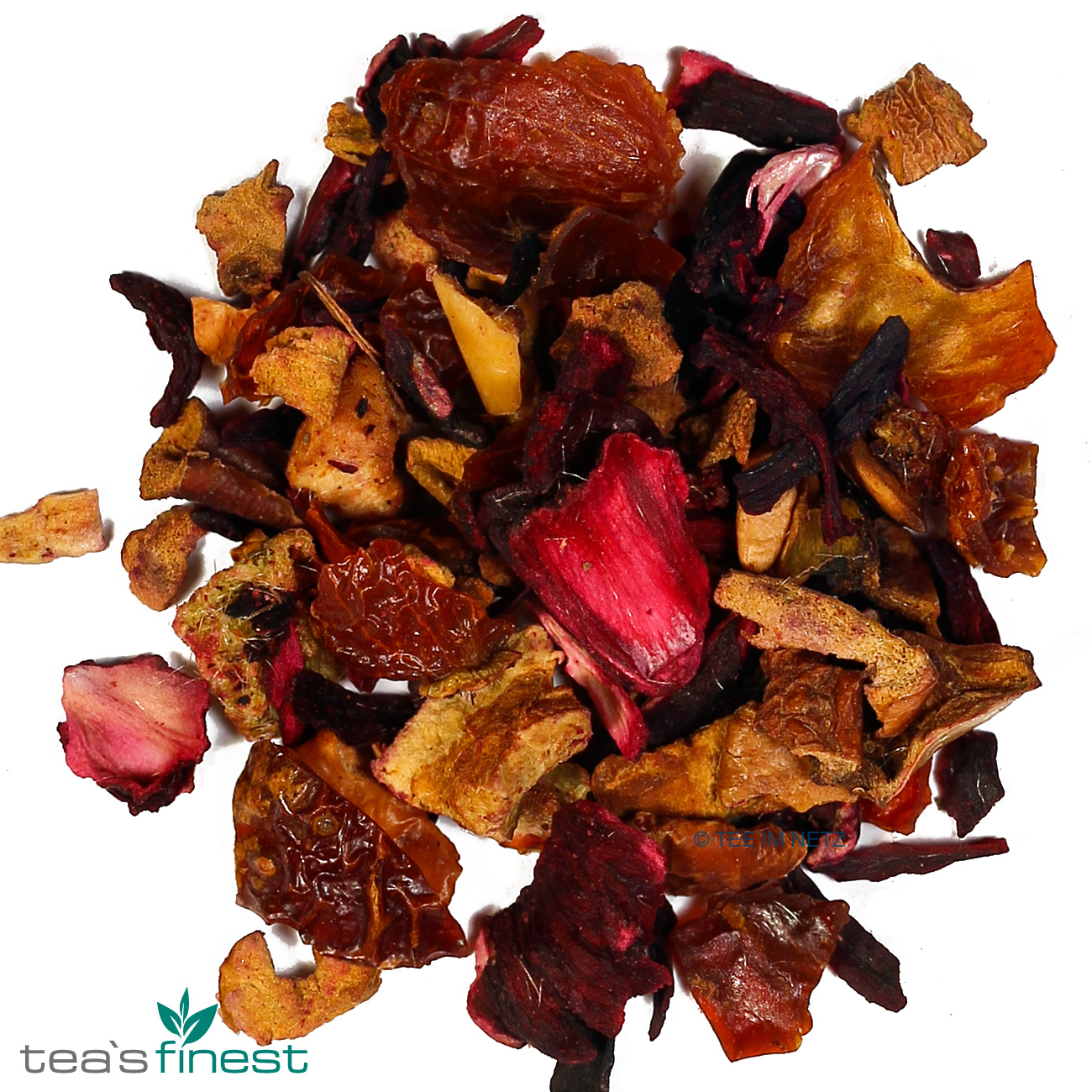 Zutaten: Apfelstücke, Hagebuttenschalen, Hibiskusblüten, Aroma, Kiwistücke, Erdbeerstücke
