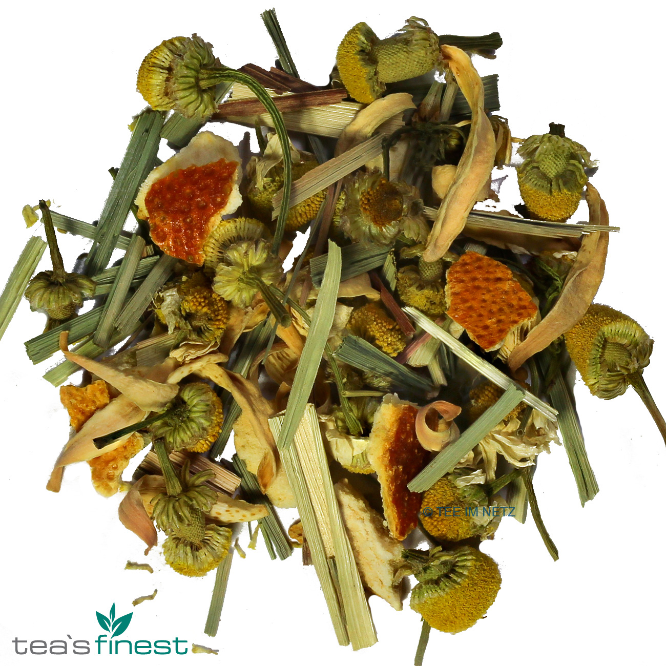 Zutaten: Kamillenblüten, Orangenblüten, Orangenschalen, Lemongras