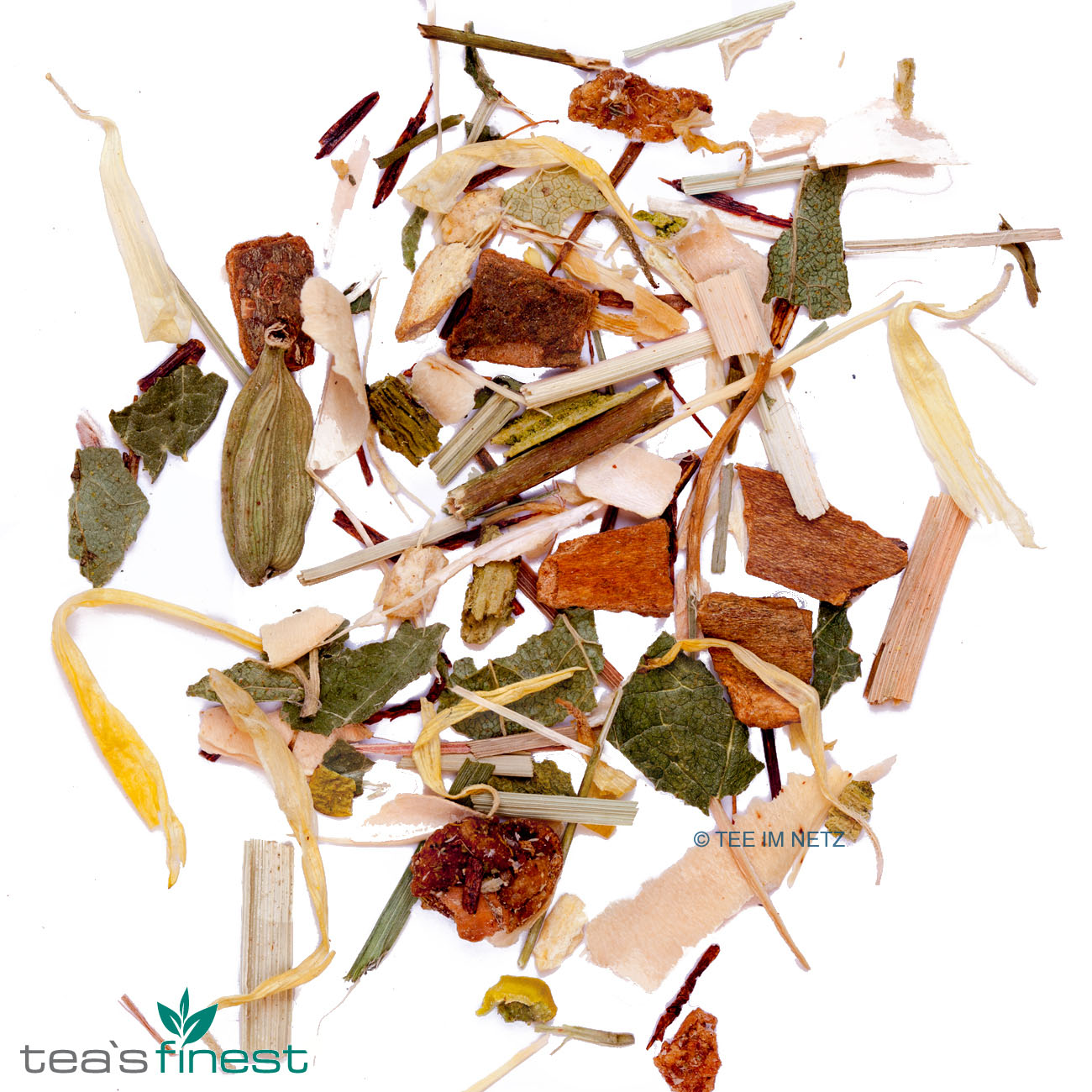 Zutaten: Apfelstücke, Rooibos*, Zimtrinde, Ringelblumenblüten, Ingwer, Bohnenhülsen, Lemongras, Mistelkraut, Johanniskraut, Johannisblätter, Cardamom, Ginsengwurzel, Aroma