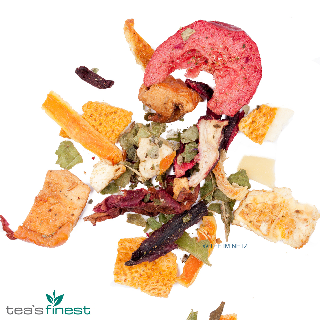Zutaten: Apfelstücke, Orangenschalen, Hibiskusblüten, Brombeerblätter, gehobelte Mandeln, Karottenraspeln, Sternanis, Zimt, Aroma, Silberlindenblüten, gefriergetrocknete Cranberryscheiben, Granatapfelkerne, Bauernrosenblüten