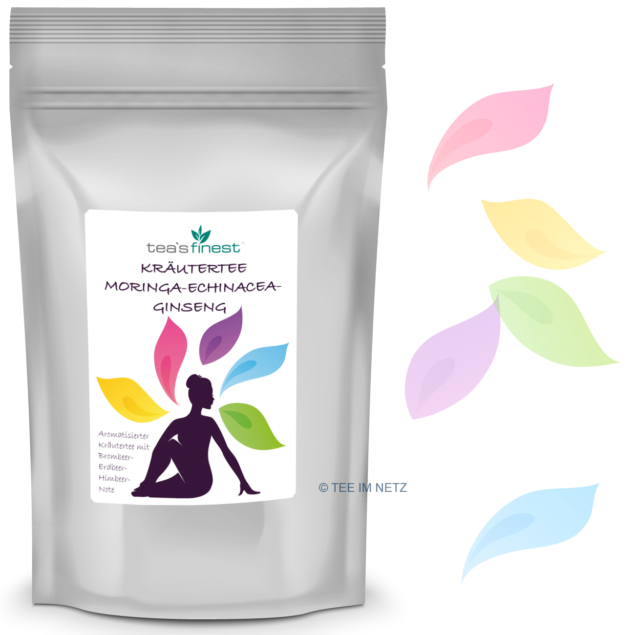 Zutaten: Apfelstücke (geröstet), Zitronenverbene, Purpursonnenhutkraut (Echinacea), Moringa Blätter (12%), Ingwerstücke, natürliches Aroma, Ringelblumenblütenblätter, Grüner Tee, Ginsengwurzel, Ginkgoblätter