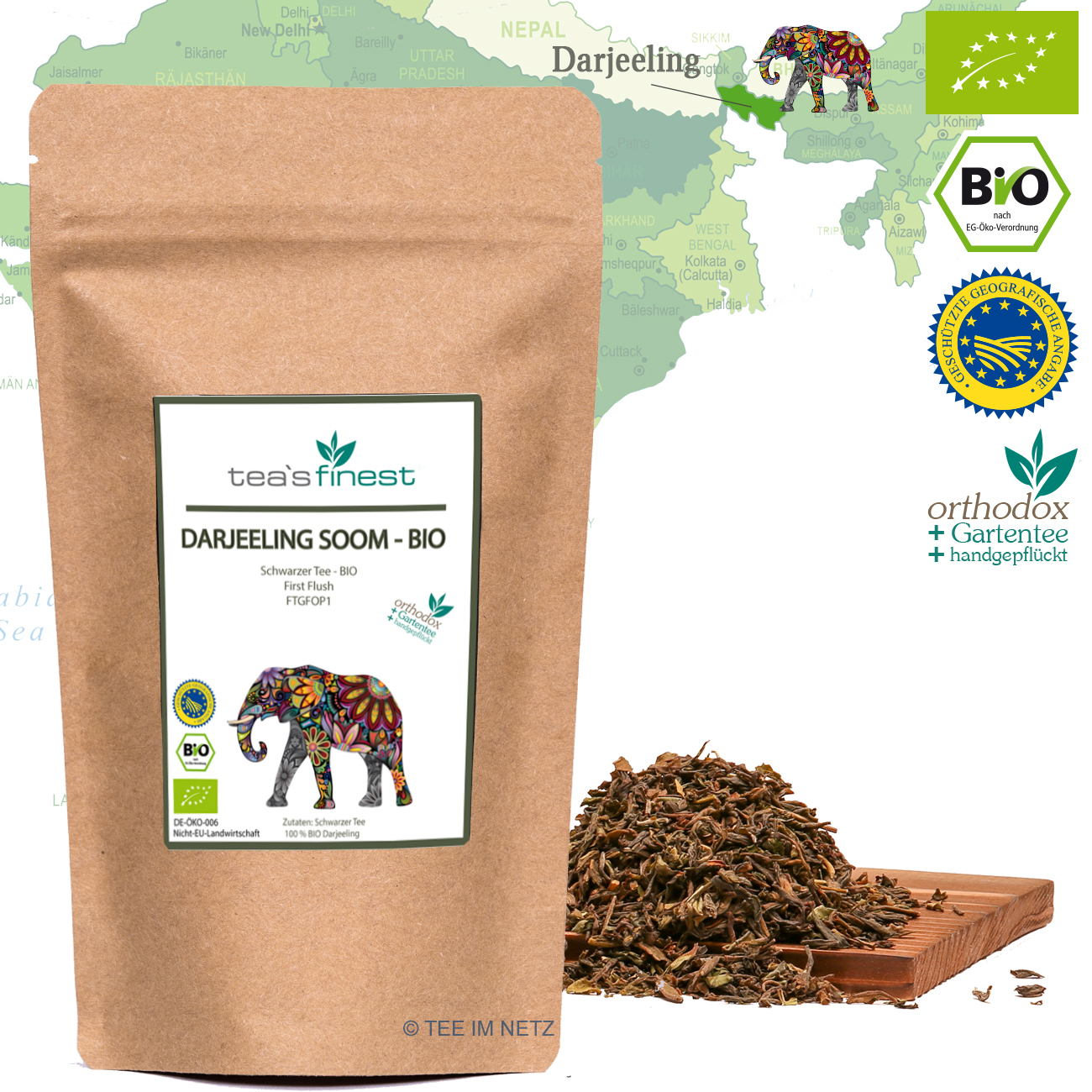 Der exclusive Teegarten Soom wurde vor über 120 Jahren angelegt. "Soom" bedeutet in der Sprache der Lepcha "das Dreieck", welches das Symbol für die Hindu-Göttin des Wohlstands ist. Von den Gipfeln der Berge kann man die Y-Form dieser Plantage sehen. Dieser First Flush Darjeeling* ist klassisch und hocharomatisch und zeichnet sich durch ein mittelgroßes, sehr gut gearbeitetes Blatt mit hellgrünen Tips aus. Die Plantage ist für einen Tee höchster Qualität berühmt. Das Bild der bernsteinfarbenen Tasse wird durch das nussig-süße und weiche Aroma perfekt abgerundet.