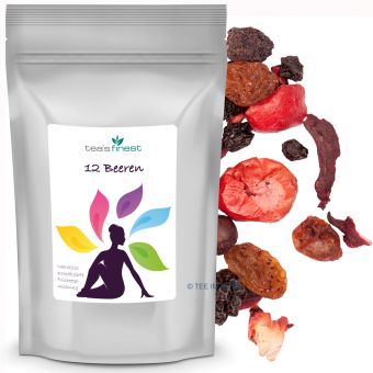 Ein ganzes Dutzend unterschiedlicher saftig praller Beeren machen diesen Früchtetee zu einem echten Geschmackserlebnis. Süße Heidelbeeren, aromatische Brombeeren, Schlehenfrüchte und Holunderbeeren sorgen für ein herrlich tiefroten und fruchtigen Teegenuss.
