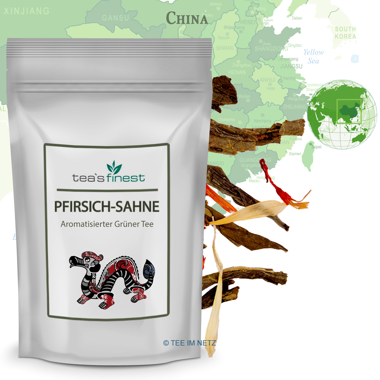 Fruchtig-sahnige Komposition aus einer feinen Grünteemischung und süßen Pfirsichstücken.